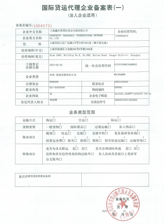 Forefront International Network is a professional LCL consolidator company. We have 15 years experience based in Shanghai and Xiamen.We Focus on SEA/ME/ISC/EU/Mediterranean/North America/Central America consolidator business. Meanwhile, We are a First Class Freight Forwarder rigister to Ministry of Commerce of the People's Republic of China. We provide integrate logistics solutions for our clients. Services include Air/Ocean Freight/Door to Door/Worldwide Trucking ect. We look forward to establishing a long-term cooperative relationship